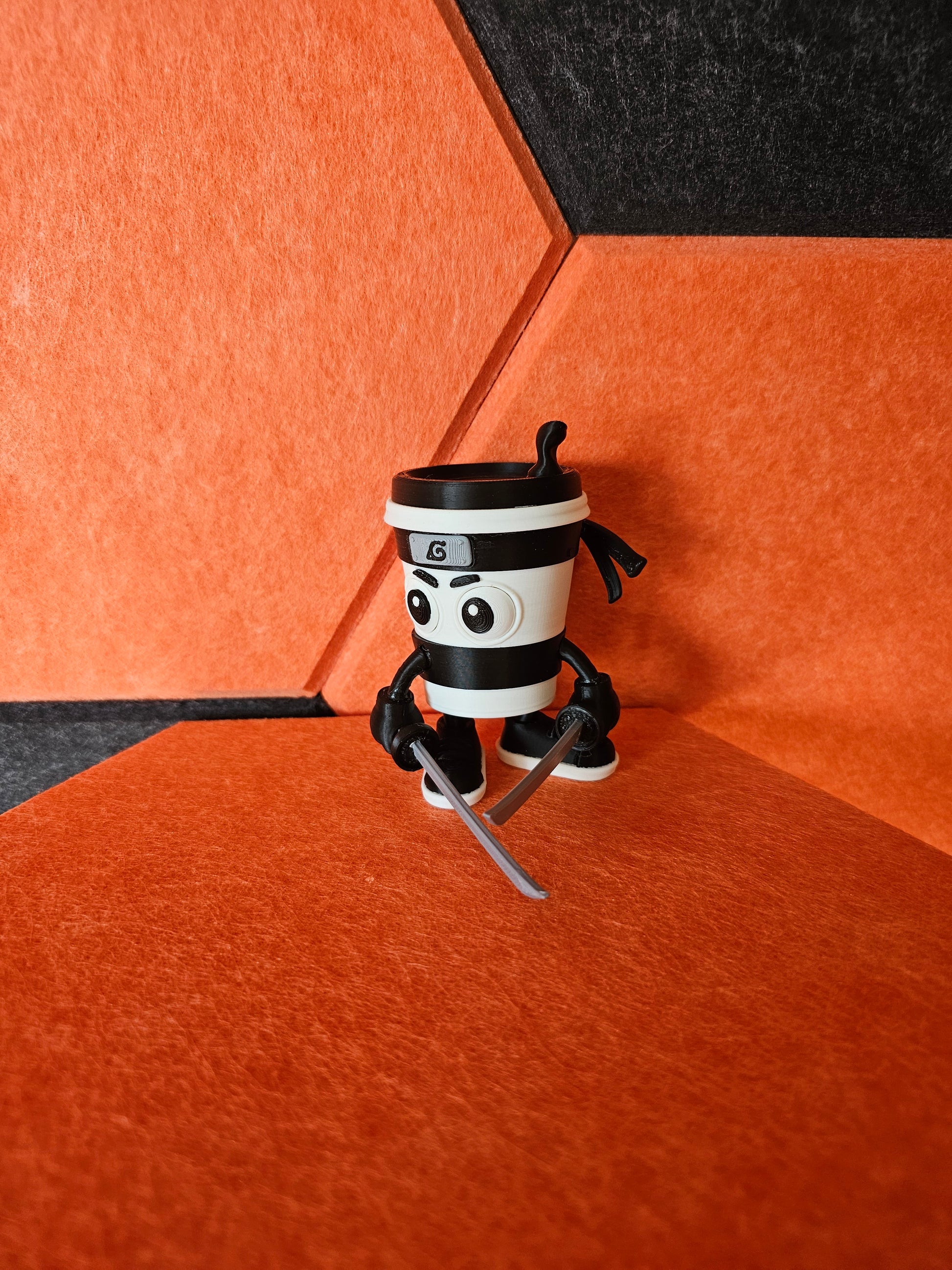 ☕ Cappacino Assassino – Energized and ready to grind, complete with arms, legs and Katanas.